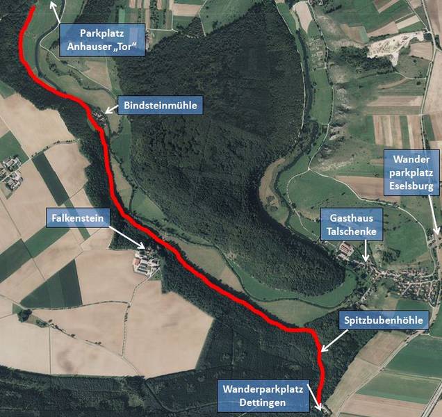 Vom Dettinger Parkplatz aus über die Spitzbubenhöhle vorbei am Falkenstein und der Bindsteinmühle in Richtung Anhausen (rot markierte Wegstrecke), denn hier wird mit dem Erwachen der Natur ein besonderes Schauspiel geboten: