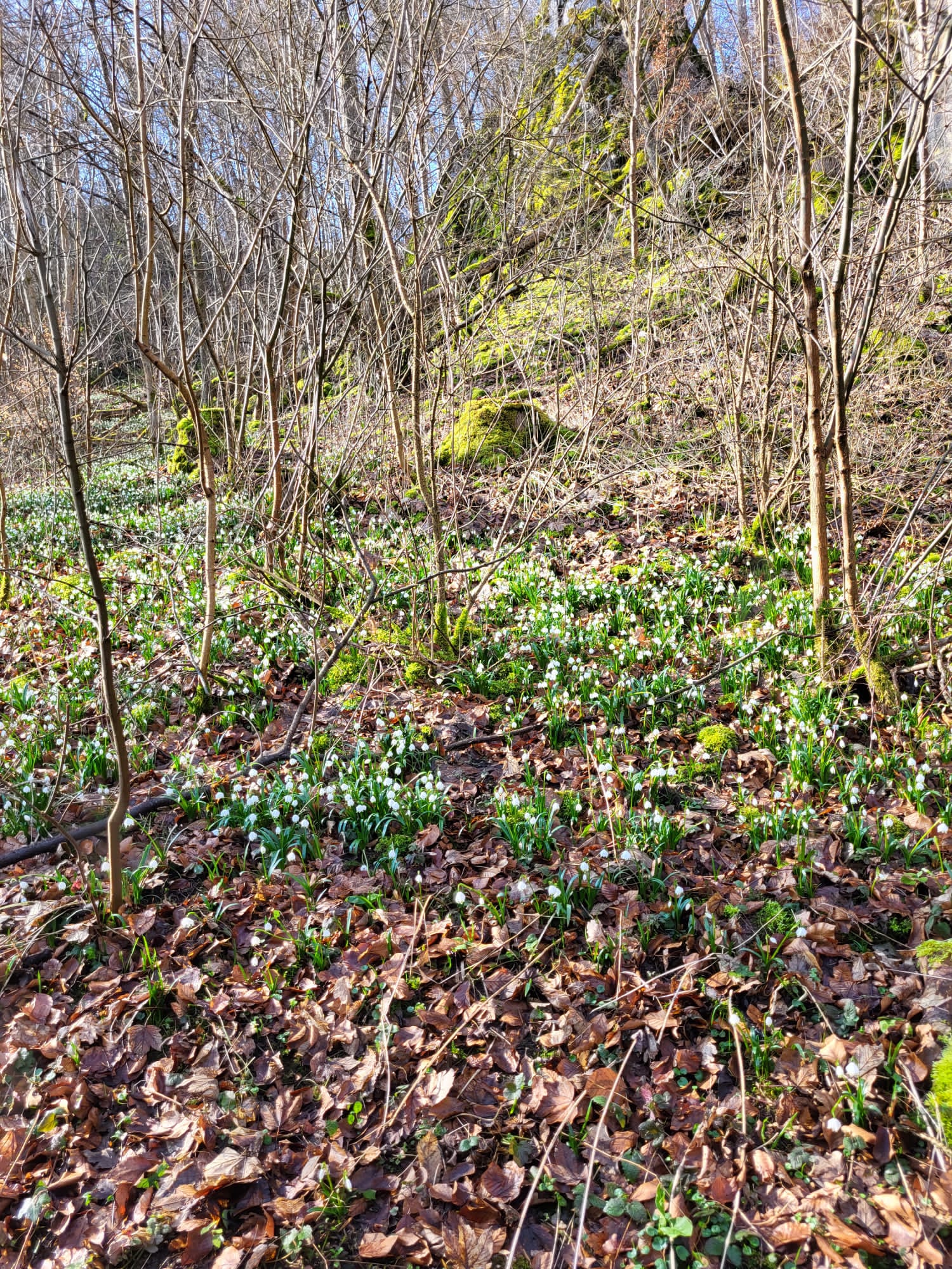 Die vielen schönen weißen Märzenbecher zeigen sich den Besucherinnen und Besuchern von ihrer besten Seite. Das Naturwunder im Eselsburgertal können wir voraussichtlich noch bis Mitte März genießen.